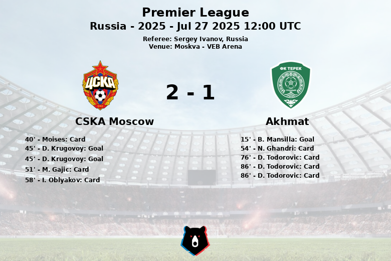 Moscow, Russia – The match between CSKA Moscow and Akhmat Grozny, played at the VEB Arena, ended in a draw with a high degree of intensity. Akhmat took an early lead with a goal by B. Mansilla in the 15th minute, assisted by E. Cacintura. CSKA reacted before halftime, with a brace by D. Krugovoy in the 45th minute, turning the score around. The match was marked by a significant number of cards, including three yellow cards for CSKA and three yellow cards and one red card for Akhmat, the latter to D. Todorovic in the 86th minute. Despite being a man down in the final minutes, Akhmat managed to withstand the pressure from CSKA, who dominated possession with 59%. CSKA accumulated 14 total shots, of which 3 were on target, while Akhmat took 11 shots, with only one directed at the opponent’s goal. The referee, Sergey Ivanov, had a busy afternoon calling 17 fouls for CSKA and 16 for Akhmat.