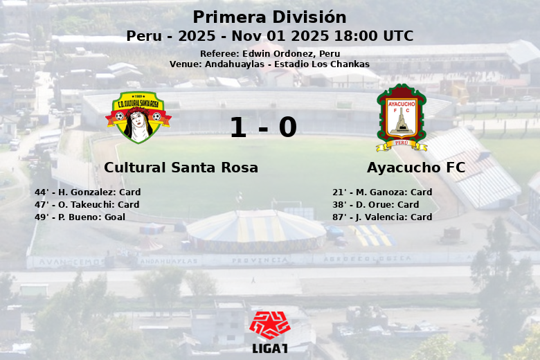 The match was marked by intensity and dispute, reflected in the numerous fouls committed (17 by Ayacucho FC and 8 by Cultural Santa Rosa) and the five yellow cards shown by referee Edwin Ordonez (three for Ayacucho FC and two for Cultural Santa Rosa). M. Ganoza, D. Orue, and J. Valencia were cautioned for Ayacucho FC, while H. Gonzalez and O. Takeuchi saw the yellow card for Cultural Santa Rosa.