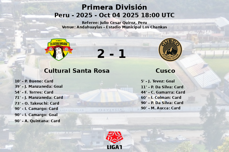 Andahuaylas witnessed a vibrant and contested match between Cultural Santa Rosa and Cusco FC, which ended in a 2-2 draw at the Estadio Municipal Los Chankas. The match, corresponding to matchday 13 of the Clausura of the Peruvian First Division, was full of emotions and tense moments.