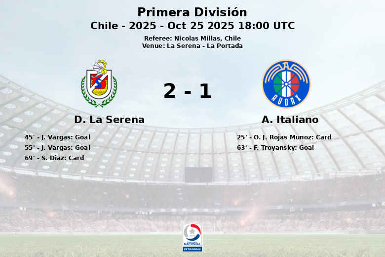 Deportes La Serena defeated Audax Italiano in a match played at the Estadio La Portada, corresponding to matchday 25 of the Primera División. The match, officiated by Nicolas Millas, was characterized by intensity and penalties.
