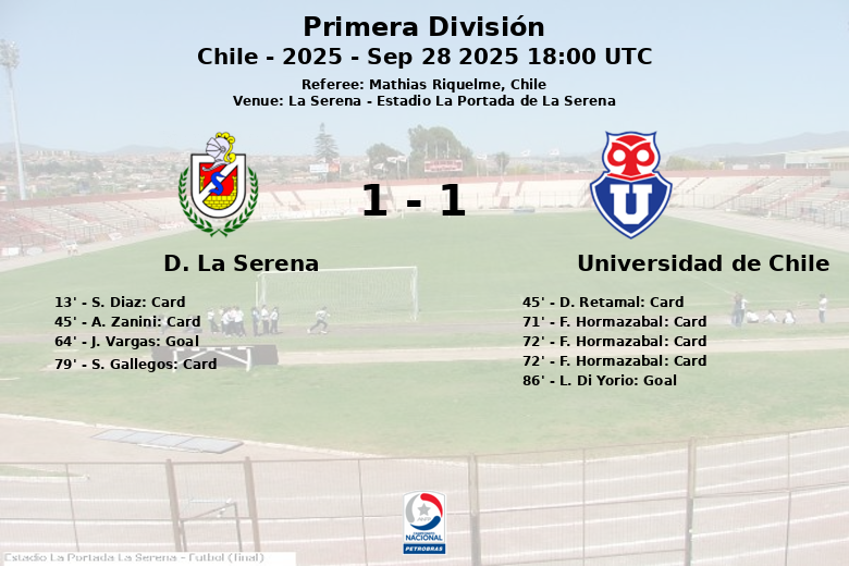 La Serena, Chile – In a hard-fought match at the Estadio La Portada de La Serena, the home team and Universidad de Chile drew in a game that had it all: goals, cards, and a red card. Ball control was clearly in favor of Universidad de Chile, with 67% possession, however, it was La Serena who opened the scoring in the 64th minute with a goal by J. Vargas, assisted by E. Moreira. Despite U. de Chile’s persistence, La Serena managed to maintain their lead until the final minutes. Universidad de Chile achieved the equalizer in the 86th minute thanks to L. Di Yorio, who received an assist from L. Assadi. The match was characterized by a stop-start game and many fouls, reflected in the three yellow cards for each team. The most intense moment came with the sending off of F. Hormazabal of Universidad de Chile in the 72nd minute, after receiving his second yellow card. Regarding shooting statistics, La Serena made 13 shots, 5 of which were on target, while Universidad de Chile made 10 total shots with 5 on target. La Serena had more corners with 8, compared to 6 for Universidad de Chile. The match, corresponding to matchday 23 of the Chilean Primera División, 2025 season, ended in a draw that leaves mixed feelings for both teams.
