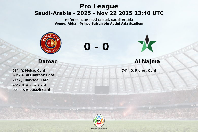 The match, corresponding to matchday 9 of the Saudi Pro League, was marked by a high number of fouls, 16 committed by Damac and 9 by Al Najma, resulting in 4 yellow cards for the home team and 1 for the visitors. Referee Fareeh Al-Jaloud had his work cut out for him maintaining order in a contested match.