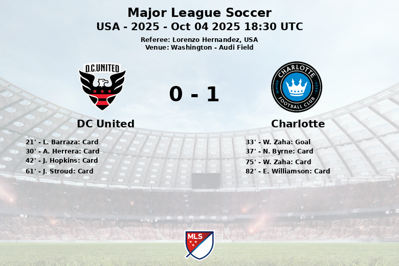 Regarding statistics, Charlotte vastly outshot DC United (13 to 8) and had more corners (13 to 4). Discipline was also a factor, with three yellow cards for Charlotte and two yellow and two red cards for DC United. Referee Lorenzo Hernandez had a busy night in the US capital.