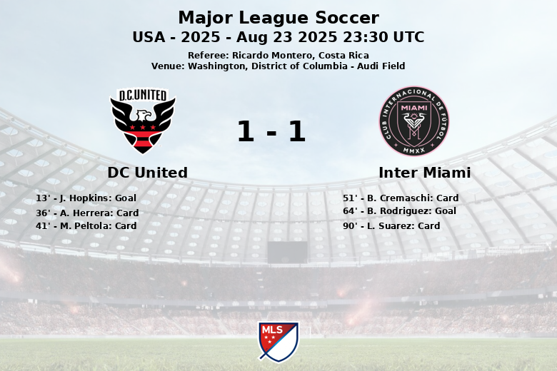 Washington, D.C. – In a hard-fought match at Audi Field, DC United and Inter Miami drew, with the visiting team clearly dominating possession (71%). DC United, with 29% possession, took an early lead thanks to a goal by J. Hopkins in the 13th minute, assisted by M. Peltola. However, Inter Miami battled to get back into the game.