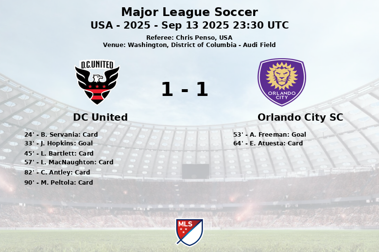 Washington, D.C. – DC United and Orlando City SC battled to a 1-1 draw at Audi Field in a match characterized by intensity and controversy. DC United, playing at home, opened the scoring in the 33rd minute with a goal from J. Hopkins, but the lead wouldn’t last. Orlando City SC responded in the 53rd minute with a goal from A. Freeman, leveling the score.