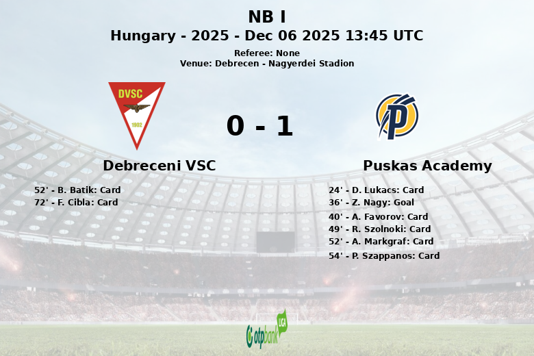 Debrecen, Hungary – In a match held at the Nagyerdei Stadion, Puskas Academy managed to overcome Debreceni VSC in a game corresponding to matchday 16 of the NB I. Despite Debreceni VSC dominating possession with 61%, Puskas Academy capitalized on their opportunities, scoring a crucial goal in the 36th minute thanks to Z. Nagy, assisted by L. Duarte.