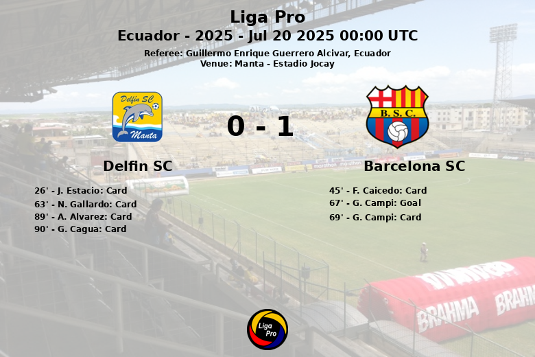 The only goal of the match came in the 67th minute, scored by G. Campi for Barcelona SC, assisted by B. Oyola. After the goal, the match remained tightly contested, with more yellow cards being shown, including one for Campi himself. Delfin SC tried to respond, but the Barcelona SC defense remained solid. In the end, Barcelona SC took all three points in a very tactical and physical game. The referee showed a total of six yellow cards throughout the match, four for Delfin SC and two for Barcelona SC.