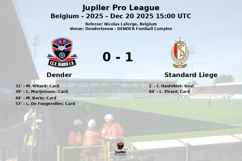 Standard Liege emerged victorious in their visit to the DENDER Football Complex in a Jupiler Pro League match on matchday 19. The game, overseen by referee Nicolas Laforge, was marked by noticeable intensity and a high number of yellow cards, particularly for the home team.