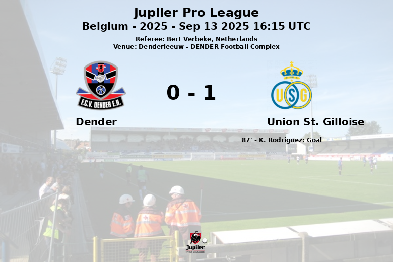 Denderleeuw, Belgium – In a match held at the DENDER Football Complex, Union St. Gilloise defeated Dender on matchday 7 of the Jupiler Pro League. The match, dominated in possession by Union St. Gilloise (64%), remained scoreless until the final minutes. Despite creating numerous opportunities (16 total shots), accuracy in front of goal was a problem for Union, with only 3 shots directed on target. Dender, with 36% possession, sought to surprise with quick transitions, but only managed 5 shots, 2 of which were on target. The winning goal for Union St. Gilloise came in the 87th minute, scored by K. Rodriguez, assisted by M. Giger. The refereeing of Bert Verbeke (Netherlands) was characterized by allowing the game to flow, showing no yellow or red cards to either team. Union St. Gilloise took all three points in a match where patience and persistence paid off in the final stretch.