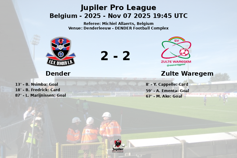 Despite Dender’s slightly favorable possession, Zulte Waregem managed to equalize in the 59th minute with a goal by A. Ementa, assisted by B. Nyssen. Zulte Waregem’s comeback continued in the 67th minute with a goal by M. Ake, assisted by E. Soglo. Just when it seemed the match was decided, Dender’s L. Marijnissen managed to score in the 87th minute, sealing the final draw.