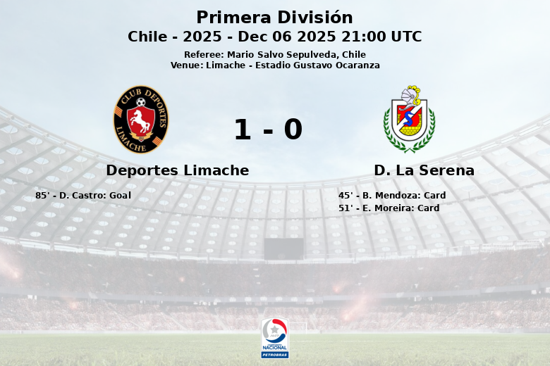 Limache, Chile – Deportes Limache secured a home victory against D. La Serena in a hard-fought match at Estadio Gustavo Ocaranza. The game, part of the 30th round of the 2025 Primera División season, was notable for Limache’s dominance in possession, reaching 73%. However, the match was characterized by high intensity and numerous fouls committed by both teams, totaling 20 throughout the game. D. La Serena received two yellow cards, issued to B. Mendoza and E. Moreira. The sole goal of the match arrived in the final minutes, courtesy of a penalty converted by D. Castro for Deportes Limache. Despite D. La Serena’s attempts to respond, Limache’s solid defense and greater control of the game allowed them to maintain their lead until the final whistle. Statistically, Deportes Limache attempted 10 shots, with 7 on target, while D. La Serena only managed to get one shot on target out of their 9 attempts.