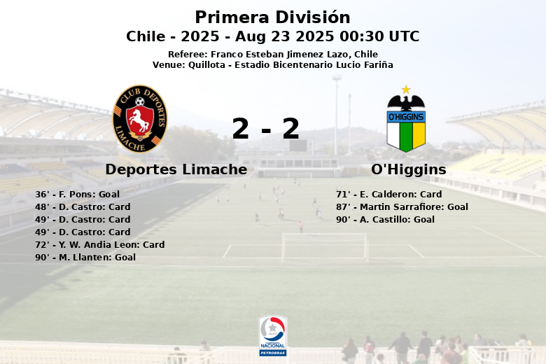 Despite the numerical disadvantage, Limache remained firm until the final minutes of the match. O’Higgins, dominating possession with 71%, relentlessly sought the equalizer and then the victory. It wasn’t until the 87th minute that Martin Sarrafiore managed to equalize the score, assisted by R. Godoy. O’Higgins’ pressure continued, and in the 90th minute, A. Castillo, assisted by Martin Sarrafiore, put his team ahead. In a dramatic finish, M. Llanten scored for Deportes Limache also in the 90th minute, closing the score. The match, refereed by Franco Esteban Jimenez Lazo, culminated in a final score that reflects the constant struggle of both teams, although the numerical superiority and the insistence of O’Higgins in the second half were decisive in securing the victory. Deportes Limache, despite playing with one man less for much of the second half, demonstrated great fighting spirit.