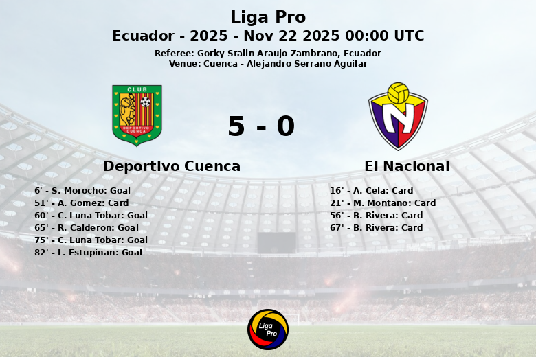 Cuenca did not slow down, and C. Luna Tobar scored again in the 75th minute, again unassisted, demonstrating his scoring ability. L. Estupinan sealed the match with a penalty goal in the 82nd minute. The match, refereed by Gorky Stalin Araujo Zambrano, left a balance of 12 shots for Cuenca (6 on target) compared to 7 for El Nacional (2 on target). El Nacional accumulated three yellow cards and one red card, evidencing frustration at Cuenca’s dominance.