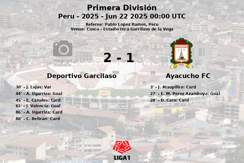 Ayacucho FC took the lead in the 27th minute thanks to a goal by E. M. Perez Azambuya, assisted by J. Lucumi. However, the joy was short-lived, as Deportivo Garcilaso reacted and A. Ugarriza equalized the score from the penalty spot in the 44th minute.
