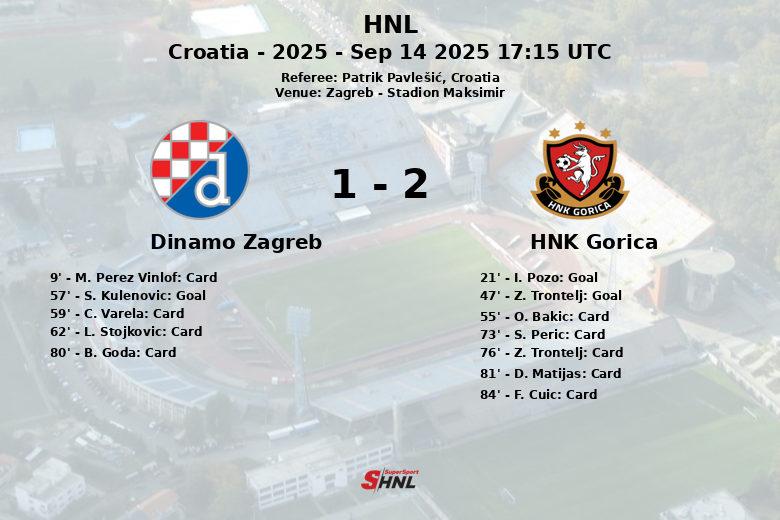 Gorica took the lead in the 21st minute with a goal by I. Pozo, assisted by Z. Trontelj. At the start of the second half, Z. Trontelj reappeared, this time scoring a goal in the 47th minute with an assist from F. Cuic, extending the lead. Dinamo tried to react and pulled one back in the 57th minute thanks to S. Kulenovic, assisted by L. Stojkovic. However, the expulsion of L. Stojkovic in the 62nd minute further complicated the task for the home team.