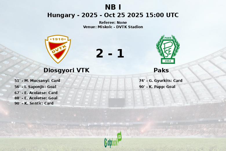 Diosgyori VTK opened the scoring in the 56th minute with a goal by I. Saponjic, assisted by Y. Croizet, unleashing joy in the local fans. Subsequently, E. Acolatse extended the lead in the 88th minute. It seemed that the victory would remain at home, but in the last minute of regulation time, K. Papp scored for Paks with an assist from A. Kinyik, sealing the final draw. The match was also marked by several yellow cards, two for Diosgyori VTK and one for Paks, reflecting the intensity with which each ball was disputed.