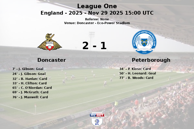 Doncaster defeated Peterborough in a hard-fought match at the Eco-Power Stadium, in the 18th round of League One. The home team made the most of their opportunities, demonstrating great effectiveness in the first half. J. Gibson emerged as the star of the match, scoring two early goals in the 7th and 24th minutes, both assisted by L. Molyneux and G. Broadbent respectively, giving Doncaster a comfortable lead.