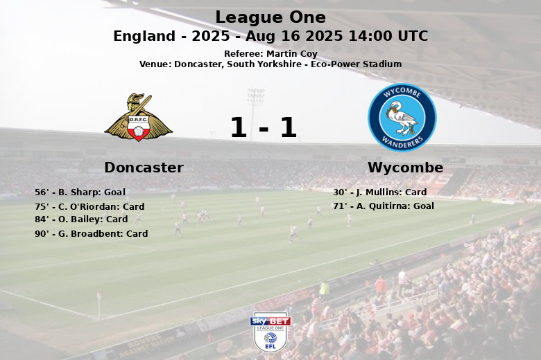 Doncaster took the lead in the 56th minute thanks to a goal from B. Sharp. However, Wycombe responded in the 71st minute with a goal from A. Quitirna, leveling the scores.