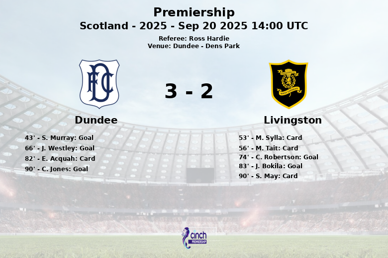 Dundee, Scotland – In a thrilling match held at Dens Park, Dundee triumphed over Livingston with a final score of 3 to 2. The game, part of the Scottish Premiership, was packed with action and tense moments.
