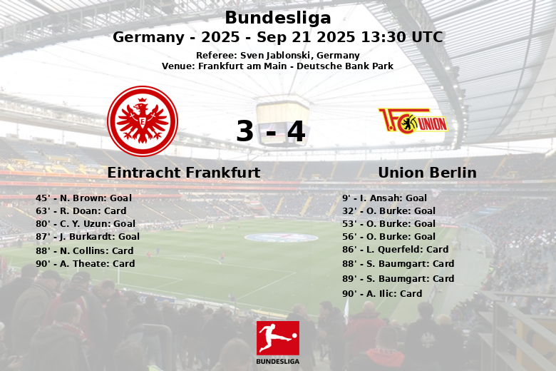 Union Berlin opened the scoring early, in the 9th minute, thanks to I. Ansah, assisted by A. Ilic. Shortly after, O. Burke extended the lead in the 32nd minute, also assisted by Ilic. Eintracht responded just before halftime, in the 45th minute, with a goal from N. Brown, assisted by E. Wahi, bringing the score to 1-2 at the break.