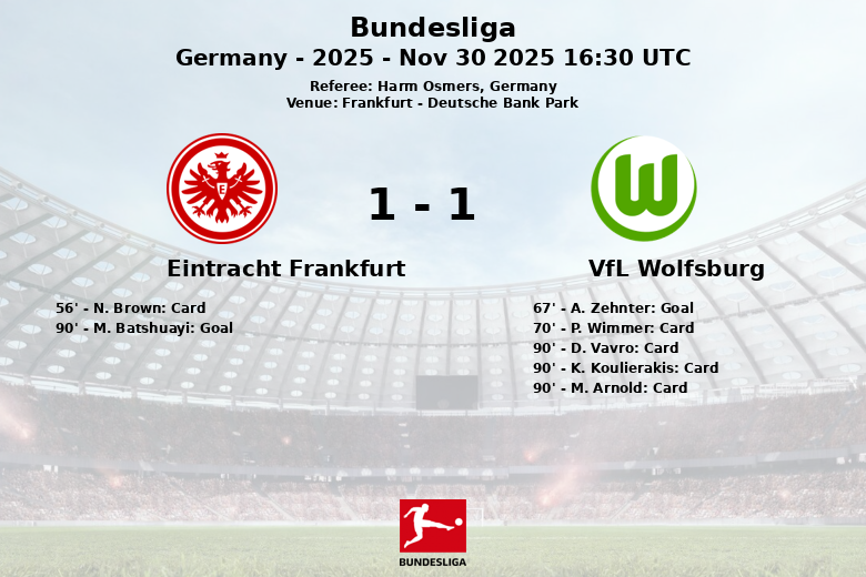 The game remained scoreless until the 67th minute when A. Zehnter, assisted by S. Kumbedi, opened the scoring for VfL Wolfsburg. Eintracht Frankfurt did not give up and sought the equalizer until the very end. The home side’s persistence paid off in added time when M. Batshuayi converted a penalty, sealing the final draw.