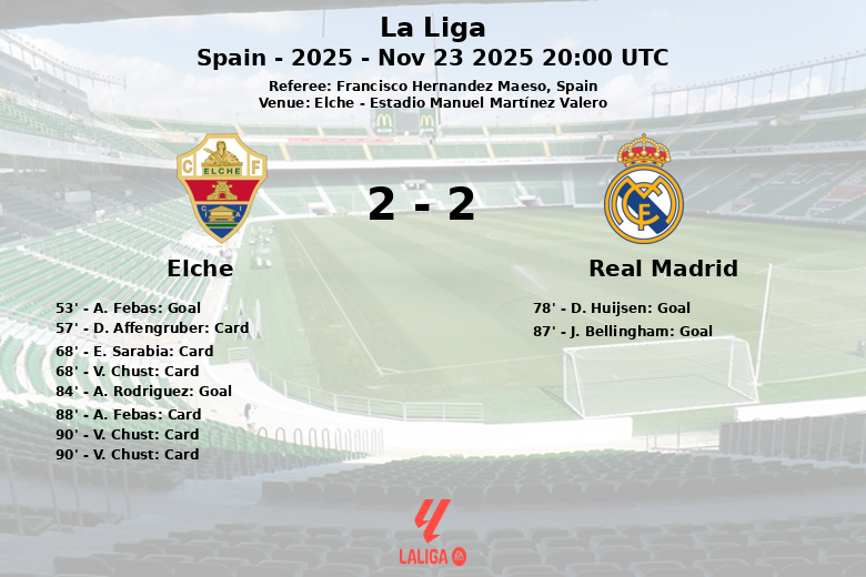 Elche took the lead in the 53rd minute thanks to a goal by A. Febas, assisted by G. Valera. Real Madrid reacted in the second half and D. Huijsen equalized in the 78th minute, assisted by J. Bellingham. Just when it seemed that the match was heading for a draw, A. Rodriguez put Elche ahead again in the 84th minute, assisted by M. Neto. However, J. Bellingham reappeared on the scoreboard in the 87th minute, assisted by K. Mbappe, sealing the final draw.