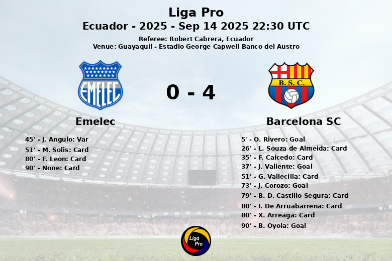 While Emelec dominated possession with 55%, Barcelona SC was more effective in front of goal, capitalizing on their opportunities. The statistics reflect a contested match, with 8 shots on goal by Barcelona SC compared to 3 by Emelec. Referee Robert Cabrera, from Ecuador, had a busy night in this Ecuadorian classic.