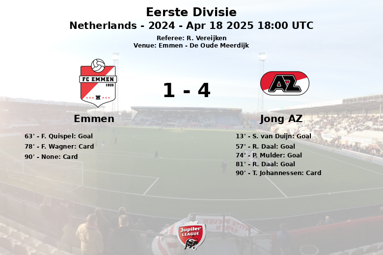 S. van Duijn opened the scoring for Jong AZ in the 13th minute, assisted by A. Smits. R. Daal extended the lead in the 57th minute. Emmen pulled one back in the 63rd minute through F. Quispel, but Jong AZ responded with an own goal by P. Mulder in the 74th minute. R. Daal sealed the victory with a penalty in the 81st minute.