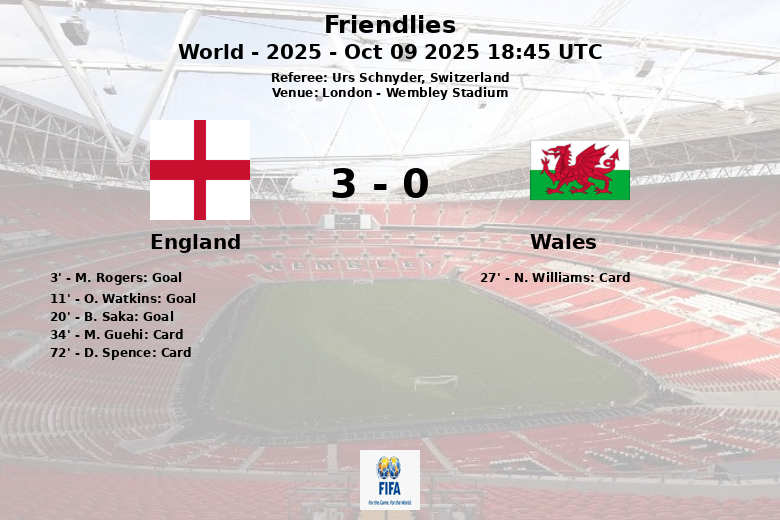 Wales attempted to react, but were overwhelmed by England’s ball possession, which reached 64%. N. Williams received a yellow card in the 27th minute for Wales, while M. Guehi was cautioned for England in the 34th minute. The match remained intense, with England generating 17 shots in total (5 on target and 5 off target), while Wales managed 10 shots (2 on target and 3 off target). England also dominated in corners, with 8 in their favor compared to just 1 for Wales. Despite some attempts by Wales to react, the match concluded without further goals, solidifying England’s victory.