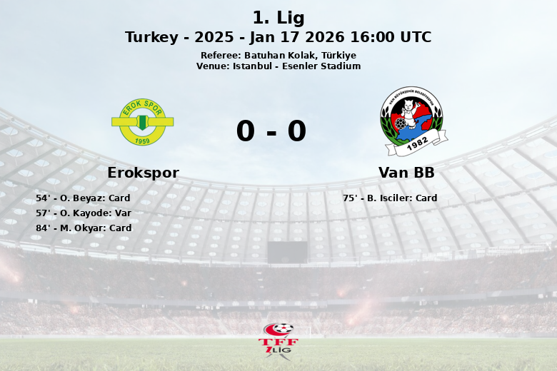 The match was tense, with a total of 27 fouls committed by both teams, resulting in three yellow cards: two for Erokspor players (O. Beyaz and M. Okyar) and one for a Van BB player (B. Isciler). A goal by Erokspor’s O. Kayode was disallowed for offside in the 57th minute, frustrating the home team’s hopes. Despite Erokspor’s 6 corners, they failed to capitalize on any of these opportunities. Van BB only managed one corner throughout the match.