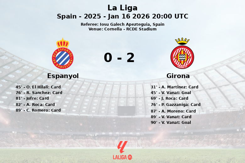 The first goal of the match arrived just before halftime, in the 45th minute, thanks to a penalty converted by V. Vanat, after an unspecified foul inside the area. The first half also saw yellow cards for A. Martinez of Girona and O. El Hilali of Espanyol, reflecting the tension on the field.