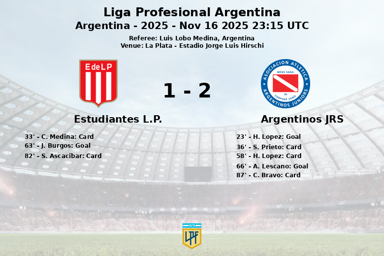 Argentinos Juniors took the lead in the 23rd minute thanks to a goal by H. Lopez, assisted by S. Prieto. The first half also saw disciplinary action, with yellow cards for C. Medina of Estudiantes (33′) and S. Prieto of Argentinos (36′).
