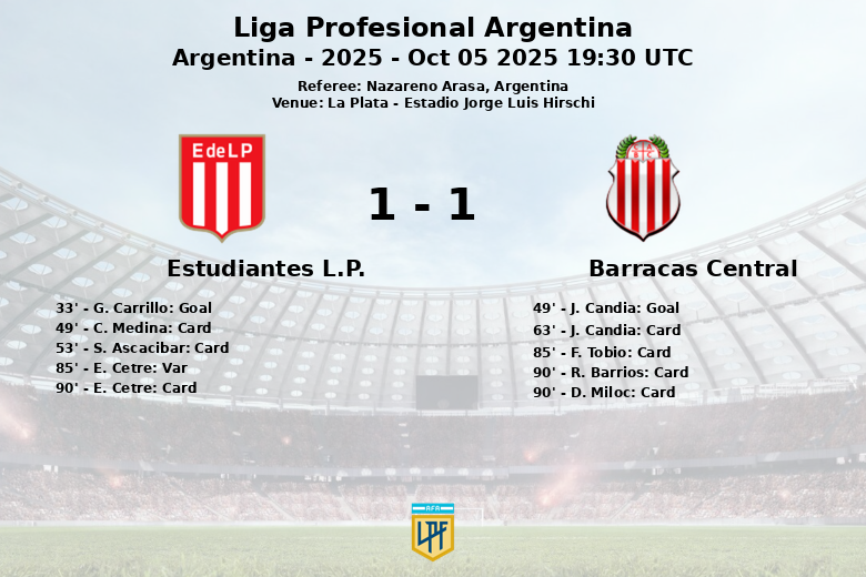 The first goal came in the 33rd minute, scored by G. Carrillo for Estudiantes, putting the home team ahead. However, Barracas Central reacted in the second half, with J. Candia equalizing the score in the 49th minute.