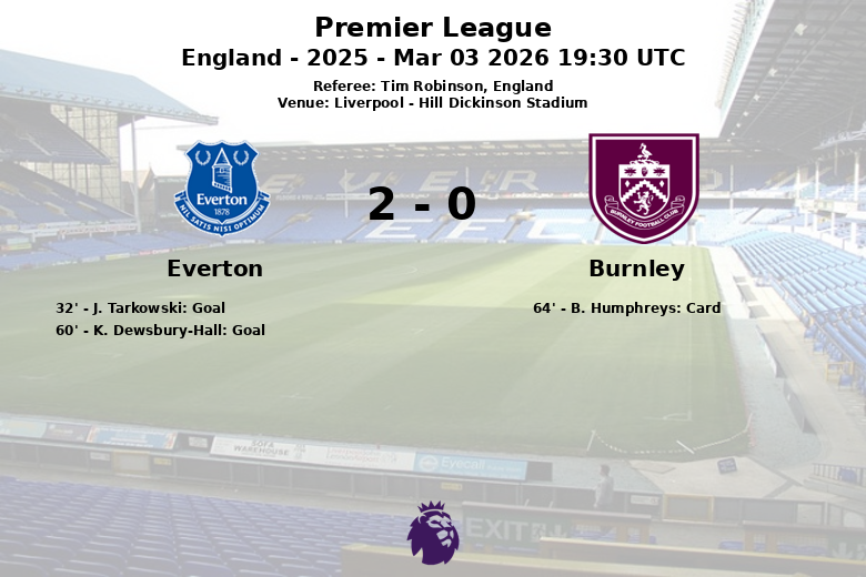 In the second half, Everton continued to press and in the 60th minute, K. Dewsbury-Hall extended the lead with a goal assisted by I. Ndiaye. Burnley, although attempting to react, encountered a solid Everton defense that limited their opportunities. The visiting team only managed to generate 5 shots, with just 3 on target. B. Humphreys from Burnley received a yellow card in the 64th minute.