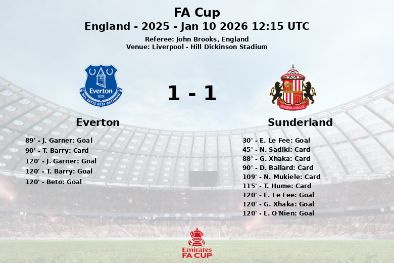 Liverpool, England – In an electrifying match held at Hill Dickinson Stadium, Sunderland and Everton drew in a game corresponding to the Round of 64 of the FA Cup, which extended into extra time and was decided in a dramatic penalty shootout. The match, officiated by John Brooks, was marked by intensity and constant struggle in the midfield.