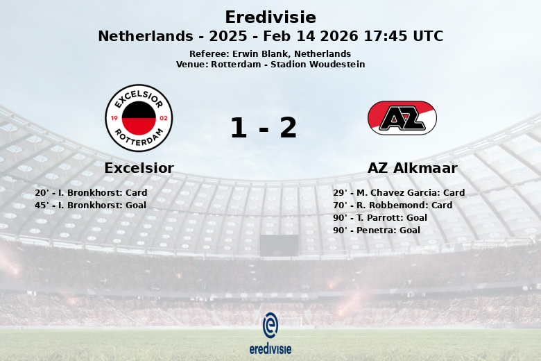 Although AZ Alkmaar had a greater number of shots (16 against 11) and more shots on target (7 against 2), Excelsior defended tooth and nail their advantage during much of the match. Referee Erwin Blank, from the Netherlands, had a busy afternoon, showing several yellow cards throughout the match. The match, played at the Stadion Woudestein, left a bittersweet taste for both teams, who add a valuable point in their aspirations within the Eredivisie.