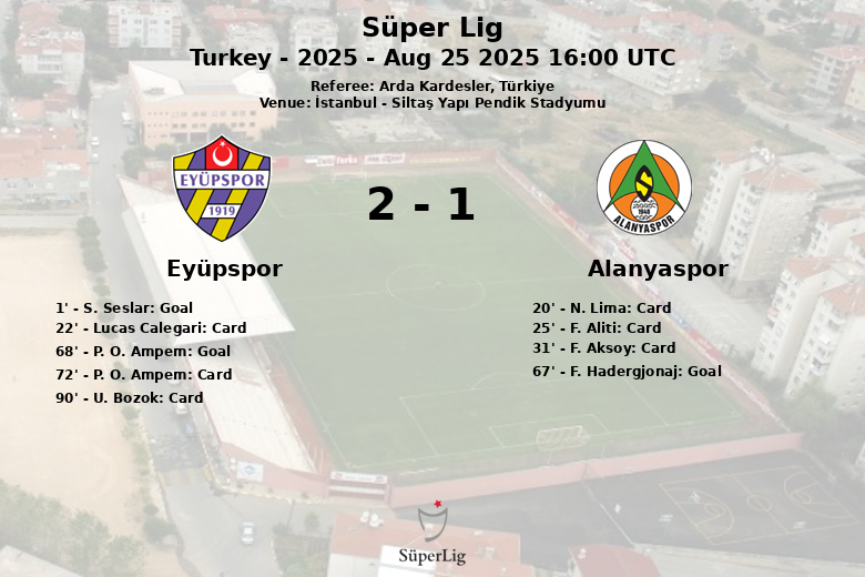 Eyüpspor took an early lead thanks to a goal by S. Seslar in the first minute of play, assisted by Y. Kayan. However, Alanyaspor managed to equalize in the 67th minute through a penalty converted by F. Hadergjonaj. Alanyaspor’s joy was short-lived, as a minute later, P. O. Ampem restored Eyüpspor’s lead with a goal assisted by Lucas Calegari.