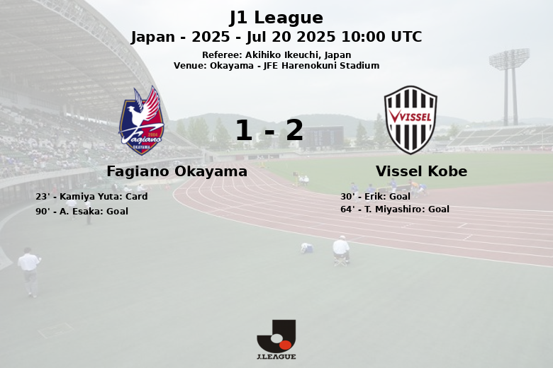 Vissel Kobe slightly dominated ball possession with 51% compared to Fagiano Okayama’s 49%. The first goal of the match came in the 30th minute, scored by Erik for Vissel Kobe, with an unspecified assist. Kamiya Yuta of Fagiano Okayama received a yellow card in the 23rd minute. Vissel Kobe extended their lead in the 64th minute with a goal by T. Miyashiro, assisted by D. Sasaki. When it seemed the match was decided, A. Esaka of Fagiano Okayama scored in the 90th minute, assisted by K. Kudo.