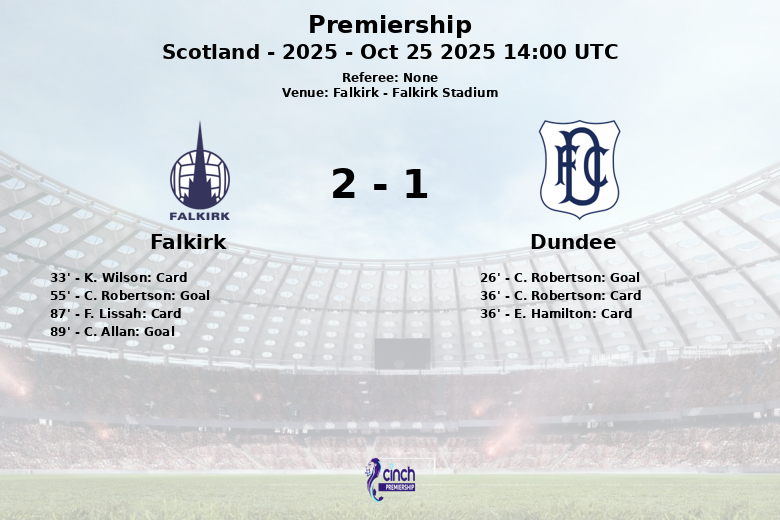 The match heated up in the first half, with yellow cards for K. Wilson of Falkirk and C. Robertson and E. Hamilton of Dundee. In the second half, Falkirk’s pressure paid off when C. Robertson of Dundee scored an own goal in the 55th minute, leveling the score. Falkirk dominated territorially, but Dundee remained firm in defense. When it seemed that the match would end in a draw, C. Allan of Falkirk scored in the 89th minute, putting his team ahead.