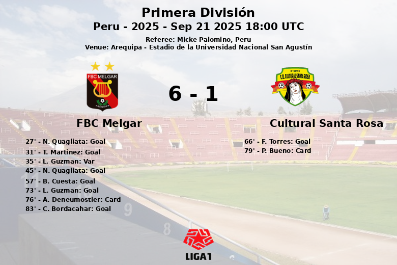 The match, played at the Estadio de la Universidad Nacional San Agustín under the refereeing of Micke Palomino, was marked by a clear dominance of Melgar, who converted 6 of the 9 shots on target they made, leaving little room for maneuver to Cultural Santa Rosa, who only managed 3 effective shots out of the 11 attempted. The match had an intense pace, with 15 fouls committed by Melgar and 10 by Cultural Santa Rosa. Both teams received one yellow card.