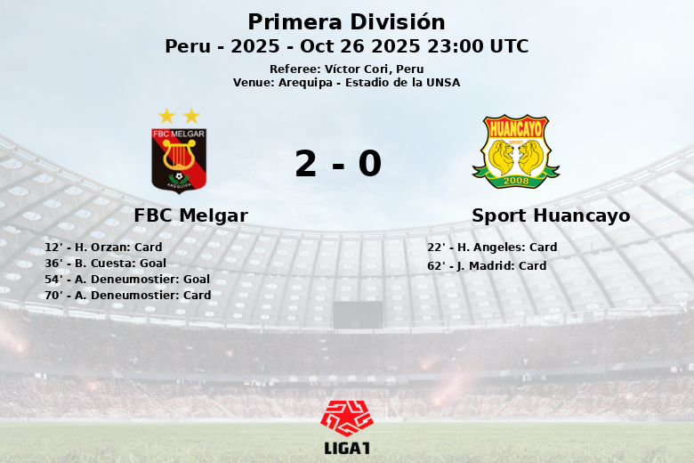 The numerical superiority translated into goals for the home team. Bernardo Cuesta opened the scoring in the 36th minute, after an assist from N. Quagliata. Extending the lead, A. Deneumostier scored in the 54th minute, also with an assist from Quagliata. Despite trying to react, Sport Huancayo failed to seriously trouble Melgar’s goal. J. Madrid of Sport Huancayo received a yellow card in the 62nd minute, and A. Deneumostier of Melgar in the 70th minute.