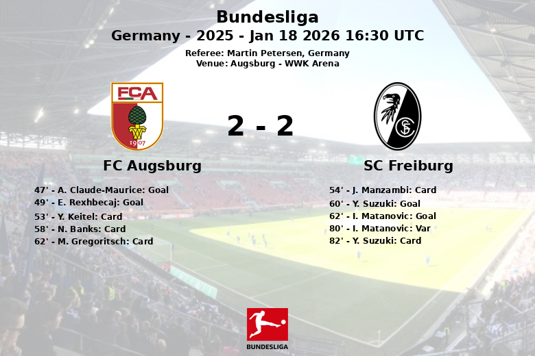 Augsburg took the lead quickly in the second half with consecutive goals from A. Claude-Maurice and E. Rexhbecaj, showing great effectiveness in the early stages of the second half. However, Freiburg reacted forcefully, propelled by goals from Y. Suzuki and I. Matanovic, who leveled the score in the blink of an eye.