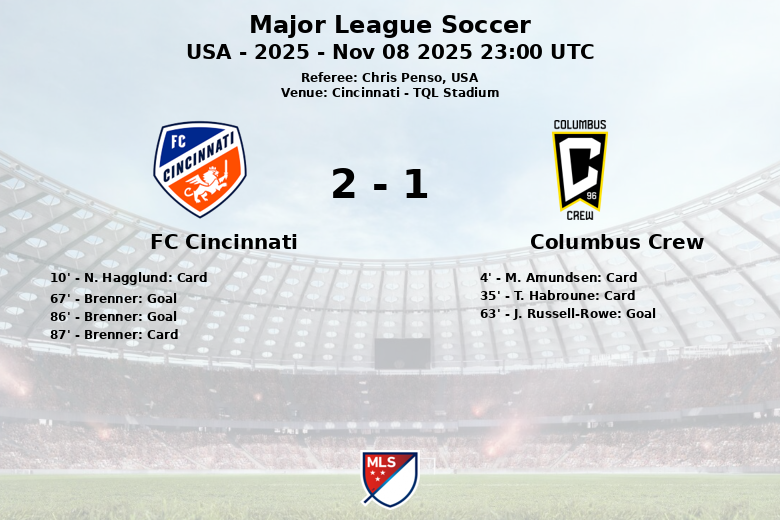 In the second half, J. Russell-Rowe put Columbus Crew ahead in the 63rd minute. However, the joy would be short-lived for the visitors, as Brenner equalized for FC Cincinnati in the 67th minute. The same Brenner would seal the victory for the home team in the 86th minute, unleashing euphoria in the stadium.