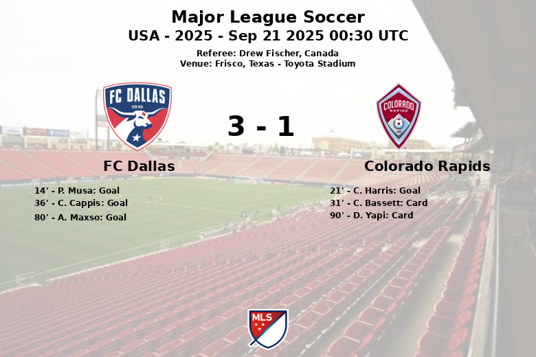 FC Dallas opened the scoring in the 14th minute with a goal by P. Musa, with no assist declared, sparking joy among the home fans. However, the Colorado Rapids responded in the 21st minute with a goal by C. Harris, leveling the score. The intensity of the match was evident with a yellow card for C. Bassett of the Colorado Rapids in the 31st minute. FC Dallas regained the lead in the 36th minute thanks to a goal by C. Cappis.