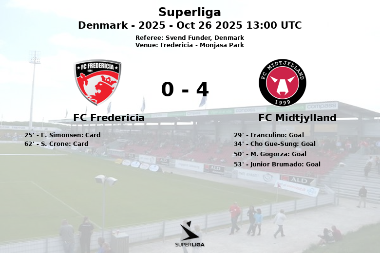In the second half, Midtjylland maintained the pressure, with M. Gogorza scoring the third goal in the 50th minute, quickly followed by a goal from Junior Brumado in the 53rd minute, assisted by O. Diao, solidifying an unquestionable victory. Despite Fredericia’s efforts, who had 33% possession and attempted to create danger with 8 shots (4 on target), they failed to penetrate Midtjylland’s solid defense. Fredericia received two yellow cards during the match, reflecting frustration at the opponent’s dominance. The match, played at Monjasa Park in Fredericia, was marked by the decisiveness of FC Midtjylland. Referee Svend Funder officiated the match.