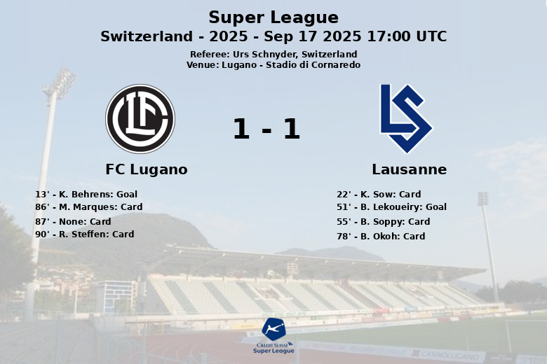 The match at the Stadio di Cornaredo between FC Lugano and Lausanne ended in a 1-1 draw, a result that reflects the intensity and balance seen on the pitch. Lugano, with 56% possession, took an early lead thanks to a goal by K. Behrens in the 13th minute, assisted by D. Dos Santos, igniting the home crowd. However, Lausanne didn’t back down and constantly sought the equalizer.