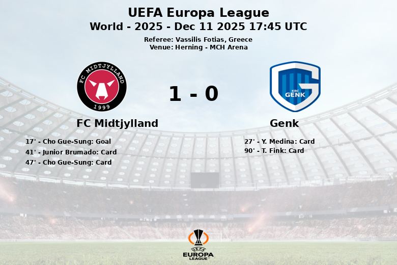 Herning, Denmark – In a hard-fought match at the MCH Arena, FC Midtjylland secured a 1-0 victory over Genk in matchday 6 of the UEFA Europa League. The lone goal of the game came in the 17th minute courtesy of Cho Gue-Sung, assisted by D. Osorio.