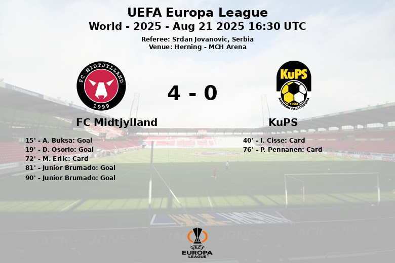 Midtjylland opened the scoring early with a goal from A. Buksa in the 15th minute, assisted by D. Osorio. Shortly after, in the 19th minute, D. Osorio extended the lead with a goal of his own, this time assisted by A. Simsir. KuPS tried to react, but encountered a solid defense and a relentless attack. The first half ended with a yellow card for I. Cisse of KuPS.