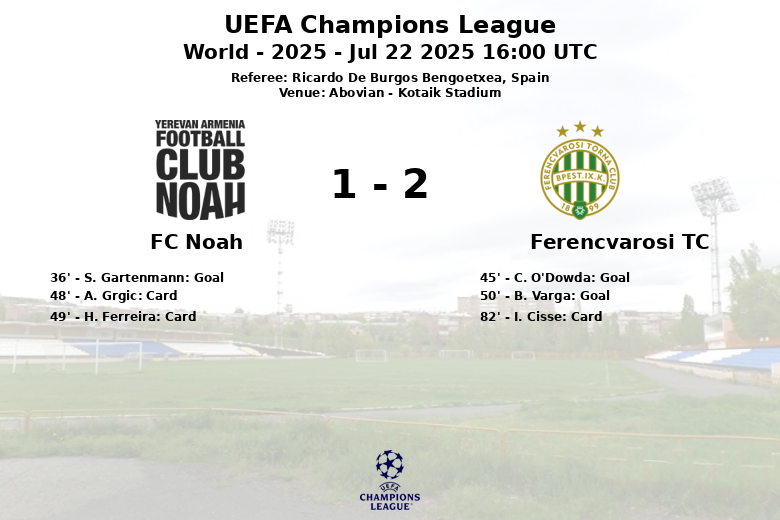 The match started with an own goal by S. Gartenmann in the 36th minute, putting FC Noah ahead. However, Ferencvarosi TC responded strongly, equalizing just before halftime thanks to a goal from C. O’Dowda in the 45th minute.