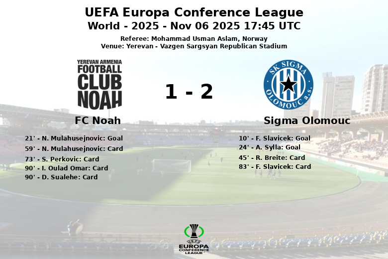 Despite dominating possession with 66%, FC Noah struggled to convert their chances, managing only two shots on target out of a total of five. On the other hand, Sigma Olomouc, with 34% possession, was more incisive in front of the opponent’s goal, registering three shots on target out of 17 attempts. The match was characterized by a contested game, with a total of 37 fouls committed by both teams and five yellow cards shown. The match, played at the Vazgen Sargsyan Republican Stadium, left a bittersweet taste for both teams in this group stage of the Conference League.